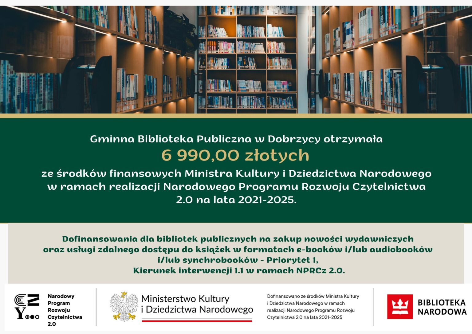 Gminna Biblioteka Publiczna w Dobrzycy otrzymała 6 990,00 złotych ze środków finansowych Ministra Kultury i Dziedzictwa Narodowego w ramach realizacji Narodowego Programu Rozwoju Czytelnictwa 2.0 na lata 2021-2025.